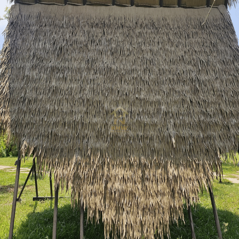 Synthetic palm thatch is an advanced roofing solution made from durable HDPE (High Density Polyethylene). It expertly replicates the appearance of natural thatch while providing superior performance. The leaves are meticulously arranged to form strong panels capable of withstanding harsh weather conditions. KHW palm thatch is frequently used for traditional tropical roofs and various construction projects. It offers excellent insulation and an eco-friendly aesthetic. Its durability and versatility make it popular for structures such as beach houses, huts, resorts, restaurants, bars, private residences, and farmhouses. For those seeking a natural appearance, KHW’s synthetic thatch roof is the premier choice in India.